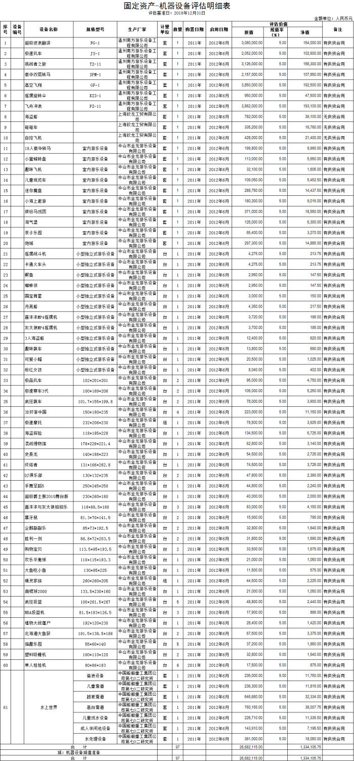 一、拍賣標(biāo)的:金領(lǐng)歡樂世界廢舊設(shè)施設(shè)備一批,包括:1、游樂場廢舊設(shè)備一批,參考價(jià)133.41萬元。該批設(shè)備已停運(yùn)三年以上,按現(xiàn)狀拍賣;2、空調(diào)等制冷設(shè)備,參考價(jià)21.47萬元;3、一般桌椅、貴重桌椅、辦公用品、廚具用品,參考價(jià)4.58萬元。標(biāo)的詳情見所附清單。