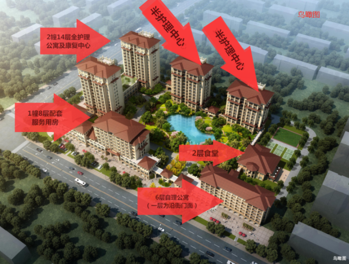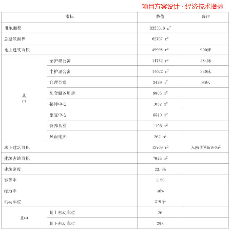 本項目設計建筑面積約6.3萬平米,其中地下室近1.3萬平方米,地上建筑5萬平米,建成后可提供1300張床位。本項目包括:1幢8層配套服務用房,2幢14層全護理公寓及康復中心,1幢12層及1幢10層半護理中心,1幢2層食堂,1幢6層自理公寓(自理公寓一層為沿街門面),地下建筑部分(包括人防工程)。