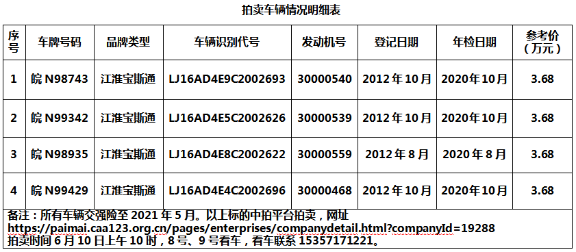 四、注意事項:有意競買者請交納保證金每輛車1萬元,至賬戶:安徽邦德拍賣有限公司,開戶銀行:中國工商銀行股份有限公司六安南門支行,賬號:1314202409300068442。并于拍賣會前在網(wǎng)上完成報名手續(xù)。報名詳詢13956133366。競買不成,保證金5個工作日內(nèi)無息退還。