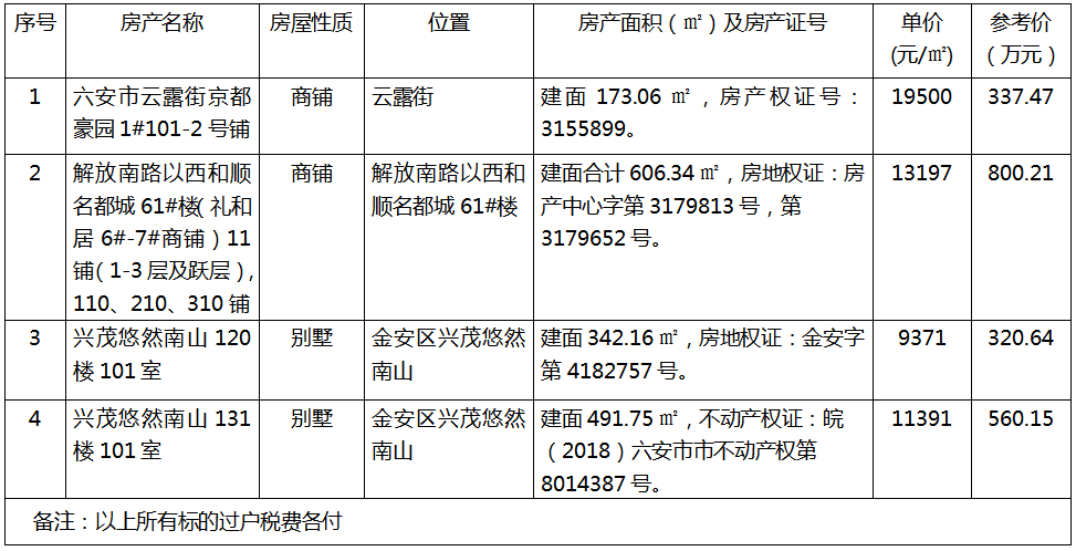 1、六安市云露街京都豪園1#101-2號(hào)鋪,房產(chǎn)權(quán)證號(hào):3155899,建筑面積173.06㎡,參考價(jià)337.47萬元;