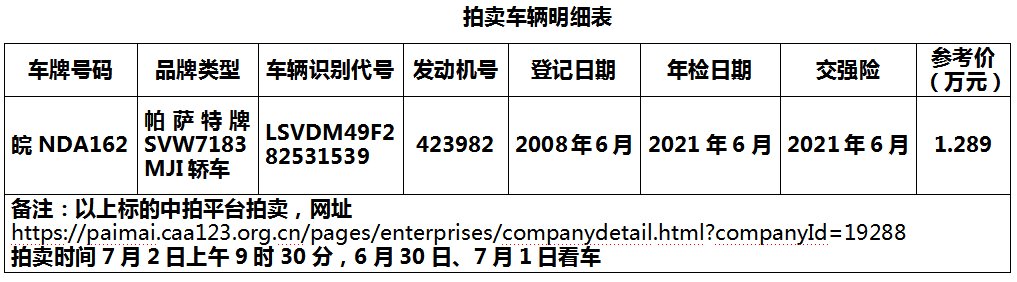 一、拍賣標(biāo)的:皖NDA162帕薩特牌SVW7183MJI轎車,2008年6月注冊(cè),參考價(jià)1.289萬(wàn)元。