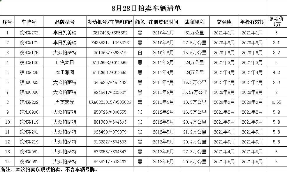 14輛公務(wù)用車(chē)(車(chē)牌號(hào)為本次拍賣(mài)車(chē)輛的依據(jù),拍賣(mài)不含車(chē)輛號(hào)牌,詳見(jiàn)拍賣(mài)清單),參考價(jià):0.65-6萬(wàn)元/輛。違章由車(chē)輛原單位處理,車(chē)輛以交付時(shí)的實(shí)際情況為準(zhǔn),車(chē)輛圖片請(qǐng)查看公司微信號(hào):安徽邦德拍賣(mài)