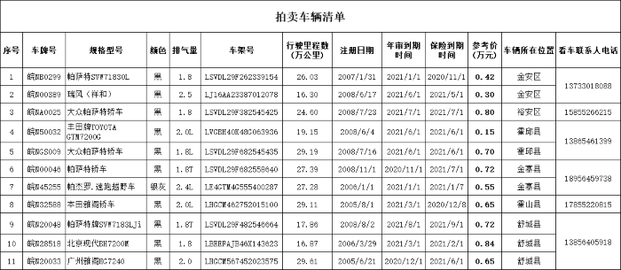 二手車11輛(車牌號為本次拍賣車輛的依據(jù),拍賣不含車輛號牌,詳見拍賣清單)。違章由車輛原單位處理,車輛以交付時的實際情況為準(zhǔn),參考價:0.15-0.84萬元/輛。車輛詳情請點擊下圖,可以放大。