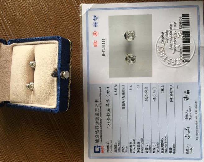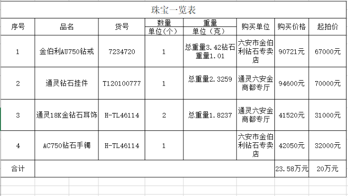 一、拍賣標(biāo)的:金伯利AU750鉆戒一個(gè)、通靈鉆石掛件一個(gè)、通靈18K金鉆石耳飾兩個(gè)(一對(duì)),AC750鉆石手鐲一個(gè)。詳情見下表。