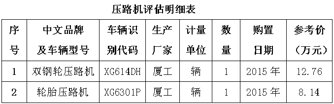 1、雙鋼輪壓路機,車輛識別代碼XG614DH,生產(chǎn)廠家:廈工,購置日期:2015年。參考價:12.76萬元。