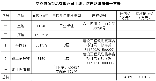 一、拍賣標(biāo)的:位于六安市金安經(jīng)濟(jì)開發(fā)區(qū)鳳凰路與山源路交匯處六安艾克威紡織品有限公司所擁有的房產(chǎn)(約15307.3㎡)、工業(yè)土地(約14646㎡)、附屬物等,整體變賣,參考價1831.7萬元。