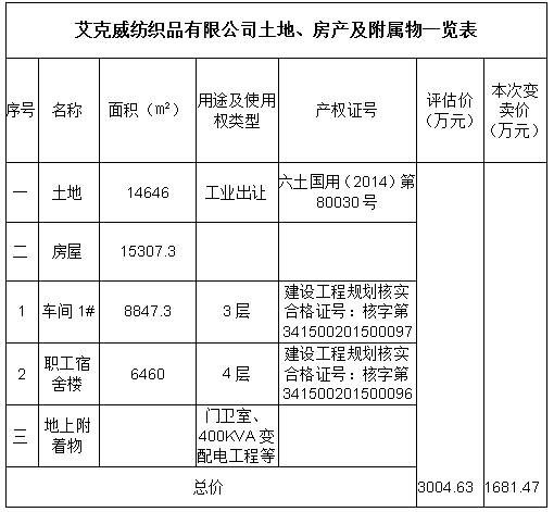 一、變賣標(biāo)的:位于六安市金安經(jīng)濟(jì)開發(fā)區(qū)鳳凰路與山源路交匯處六安艾克威紡織品有限公司所擁有的房產(chǎn)(約15307.3㎡)、工業(yè)土地(約14646㎡)、附屬物等,整體變賣,參考價1681.47萬元。