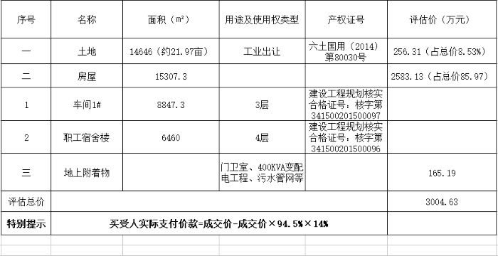 位于六安市金安經(jīng)濟(jì)開發(fā)區(qū)鳳凰路與山源路交匯處六安艾克威紡織品有限公司所擁有的房產(chǎn)(約15307.3㎡)、工業(yè)土地(約14646㎡)、附屬物等。參考價1639.4萬元。拍賣成交后,買受人最終實際支付價款為:成交價-成交價×94.5%×14%,成交價×94.5%為標(biāo)的成交價款中土地房產(chǎn)的占比價,即成交價扣除該標(biāo)的土地房產(chǎn)初始登記及交易相關(guān)稅費14%為買受人最終實際支付價款。本次扣除以預(yù)計比例14%扣除標(biāo)的土地房產(chǎn)初始登記及交易相關(guān)稅費,后期實際辦理房地權(quán)證及轉(zhuǎn)移登記到競買人名下過程中,無論產(chǎn)生多少稅費,包括按照法律規(guī)定應(yīng)由委托方(即六安艾克威紡織品有限公司)承擔(dān)的稅費,均由買受人承擔(dān)。