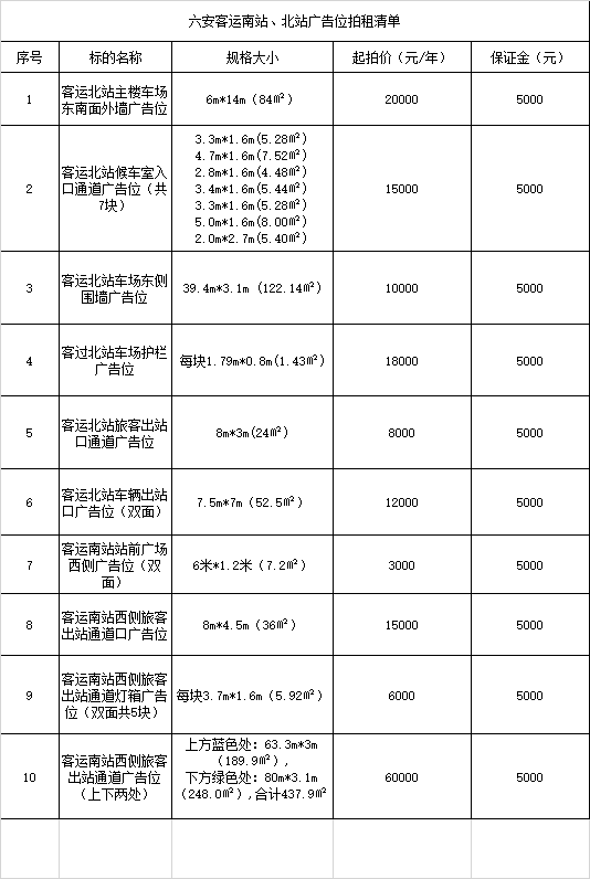 1、六安客運(yùn)南站、北站進(jìn)出口處廣告位10處拍租,具體見(jiàn)下方清單(可放大查看):