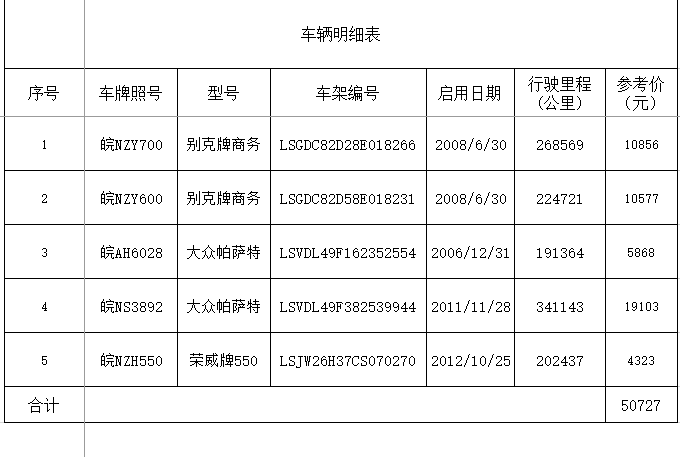 一、拍賣標(biāo)的:皖NZY700別克商務(wù)、皖NZY600別克商務(wù)、皖A(yù)H6028大眾帕薩特、皖NS3892帕薩特、皖NZH550榮威等5輛二手車,整體打包拍賣,參考價:50727元。保證金:1萬元。