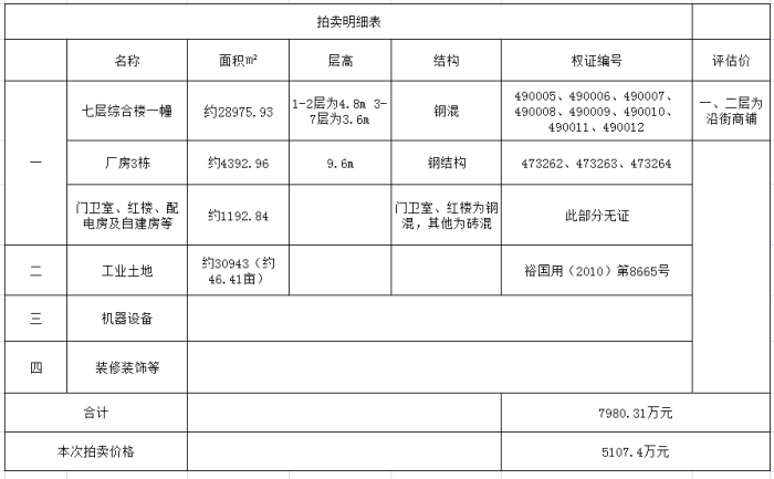 一、拍賣標(biāo)的:位于六安市裕安區(qū)城南鎮(zhèn)、沿105國道、省級(jí)高新區(qū)六安高新技術(shù)產(chǎn)業(yè)開發(fā)區(qū),六安市鴻源機(jī)械有限責(zé)任公司所擁有的房屋建筑物及附屬、土地、機(jī)器設(shè)備、裝飾裝修等,包括:1、沿105國道七層綜合樓一幢,面積約28975.93㎡,1-2層層高約4.8m ,3-7層層高約3.6m,沿105國道及其他一樓現(xiàn)作沿街門面用,二樓及以上可作服裝廠用;單層鋼構(gòu)廠房三幢,面積約4392.96㎡,層高約9.6m。以上綜合樓及廠房均有證;門衛(wèi)室、配電房及自建房等,面積約1192.84㎡,此部分無證。2、工業(yè)出讓土地30943㎡,約46.41畝,土地使用權(quán)證號(hào):裕國用(2010)第8665號(hào);3、機(jī)器設(shè)備;4、裝飾裝修等。