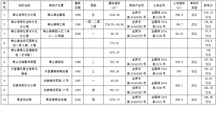 一、 拍賣(mài)標(biāo)的:金寨農(nóng)商行原儲(chǔ)蓄所、辦公樓及門(mén)面等,面積、價(jià)格、產(chǎn)權(quán)證號(hào)等詳見(jiàn)下表: