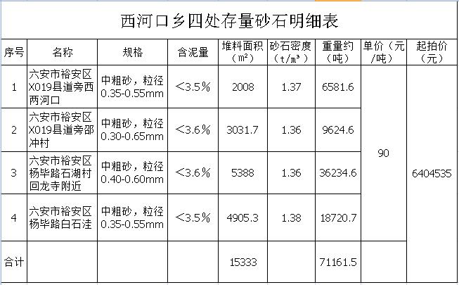 六安市西河口鄉(xiāng)四處存量砂石,分別位于河口村(中心公里網(wǎng)坐標(biāo)X:3492300,Y:433100)、邵沖村(中心公里網(wǎng)坐標(biāo)X:3490500,Y:432900)、石湖村回龍寺附近(中心公里網(wǎng)坐標(biāo)X:3483500,Y:437200)、石湖村白石洼附近(中心公里網(wǎng)坐標(biāo)X:3482800,Y:436800),總重量約71161.5噸,單價(jià)90元/噸。