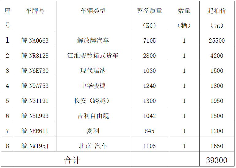 一、拍賣標(biāo)的:報廢車輛8輛,打包拍賣,參考價:3.93萬元。競拍保證金1萬元。標(biāo)的詳情見下方清單: