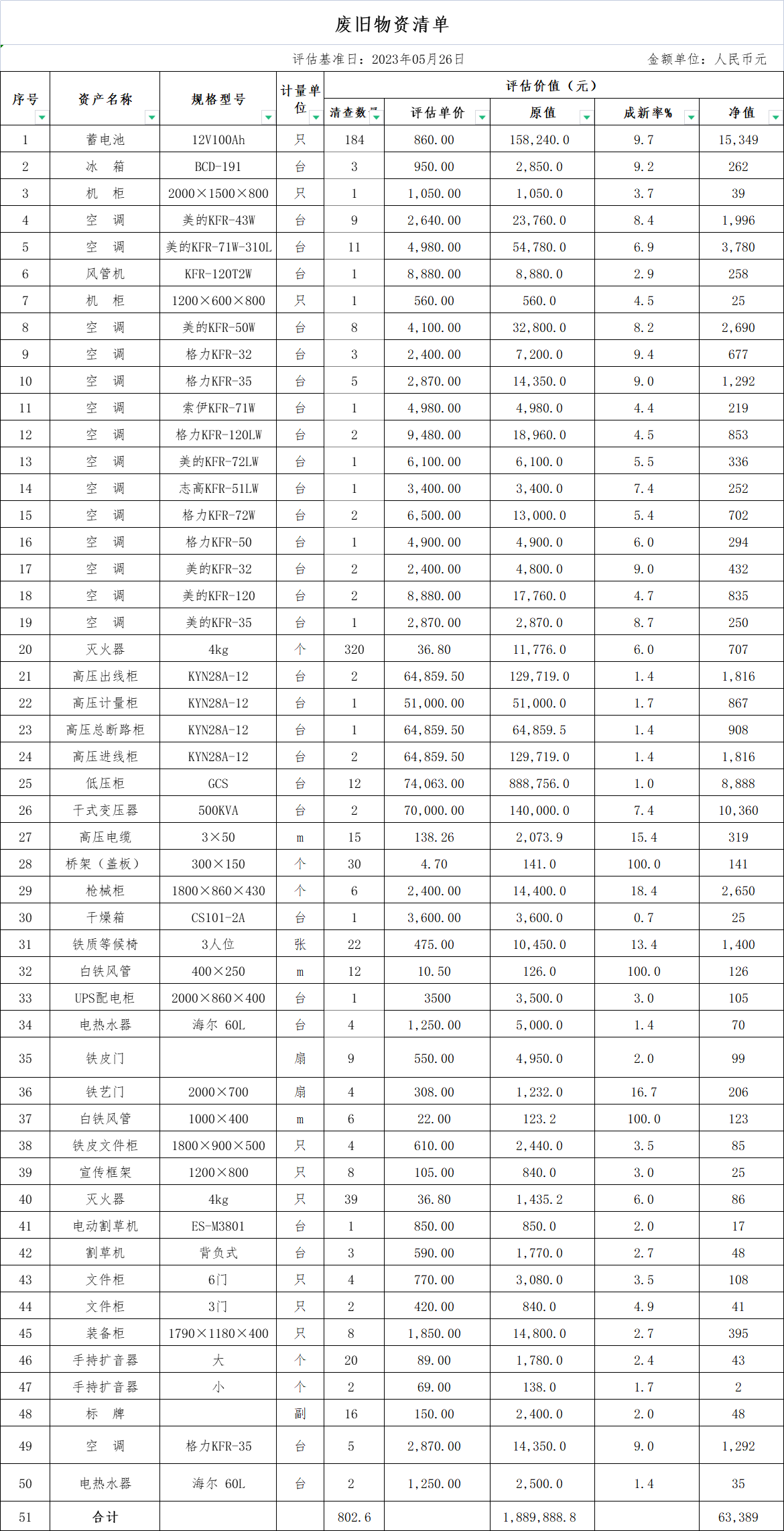 一、拍賣標(biāo)的:廢舊物資一批,包括:報廢的空調(diào)、高壓出線柜、高壓計量柜、高壓總斷路柜、低壓柜、干式變壓器等,參考價:6.3389萬元。標(biāo)的詳情見所附清單(清單僅供參考,若與實物不符以實物看樣為準(zhǔn))。