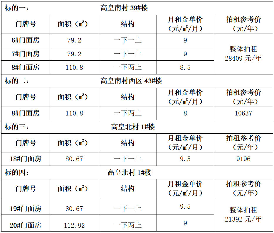 一、拍租標的:六安市裕安區(qū)平橋工業(yè)園高皇南、北村安置小區(qū)部分門面房3年期租賃經(jīng)營權,標的詳情見下表: