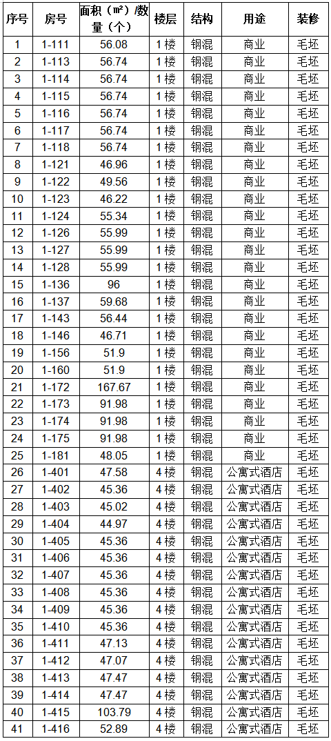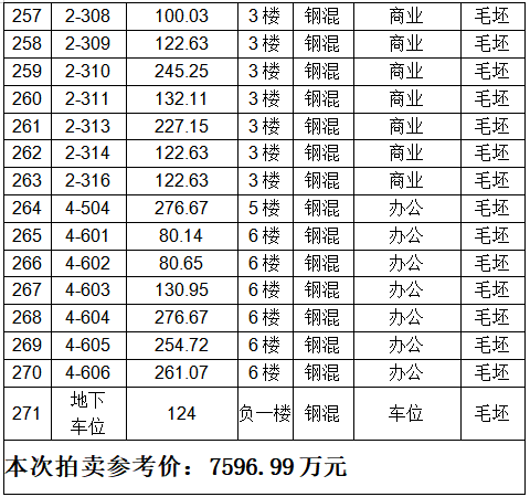 一、拍賣標(biāo)的:位于六安市金寨縣梅山鎮(zhèn)新城區(qū)紅石谷路以南、江天路以北,金寨智慧萬(wàn)匯廣場(chǎng)1、2、3、4號(hào)樓304套房屋及124個(gè)地下車位,整體打包拍賣。參考價(jià):7596.99萬(wàn)元。保證金:700萬(wàn)元。標(biāo)的詳情詳見以下標(biāo)的物清單: