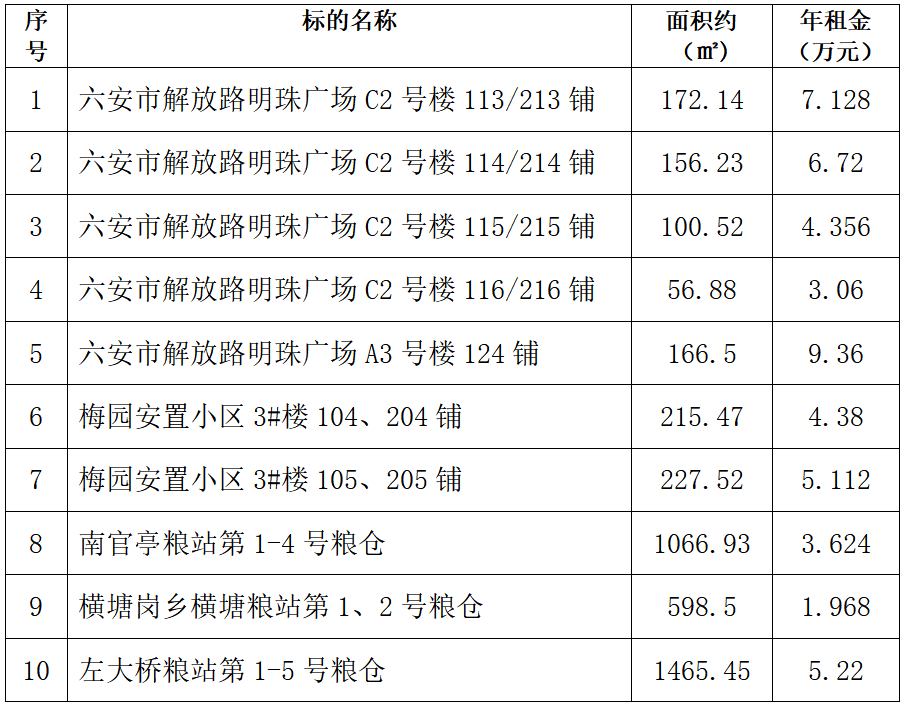 一、拍租標的:明珠廣場、梅園小區(qū)商鋪及糧站倉庫3年期租賃經(jīng)營權,標的詳情見下表: