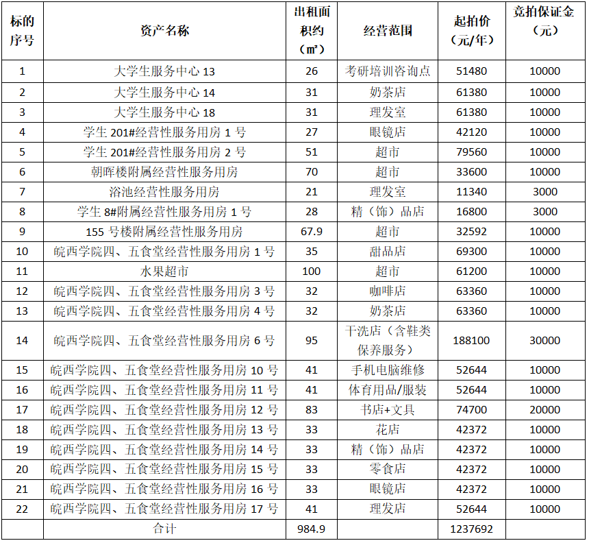 一、拍租標(biāo)的:皖西學(xué)院超市、理發(fā)室、眼鏡店、手機(jī)電腦維修、奶茶店、考研培訓(xùn)點(diǎn)等經(jīng)營(yíng)性服務(wù)用房22處三年期租賃經(jīng)營(yíng)權(quán),具體標(biāo)的詳情見下表: