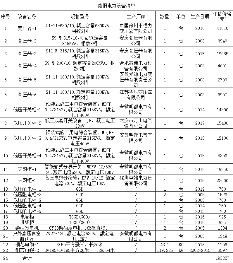一、拍賣標(biāo)的:廢舊電力設(shè)備一批,包括:變壓器、電纜、低壓配電柜等,參考價(jià)19.3827萬元。保證金2萬元。