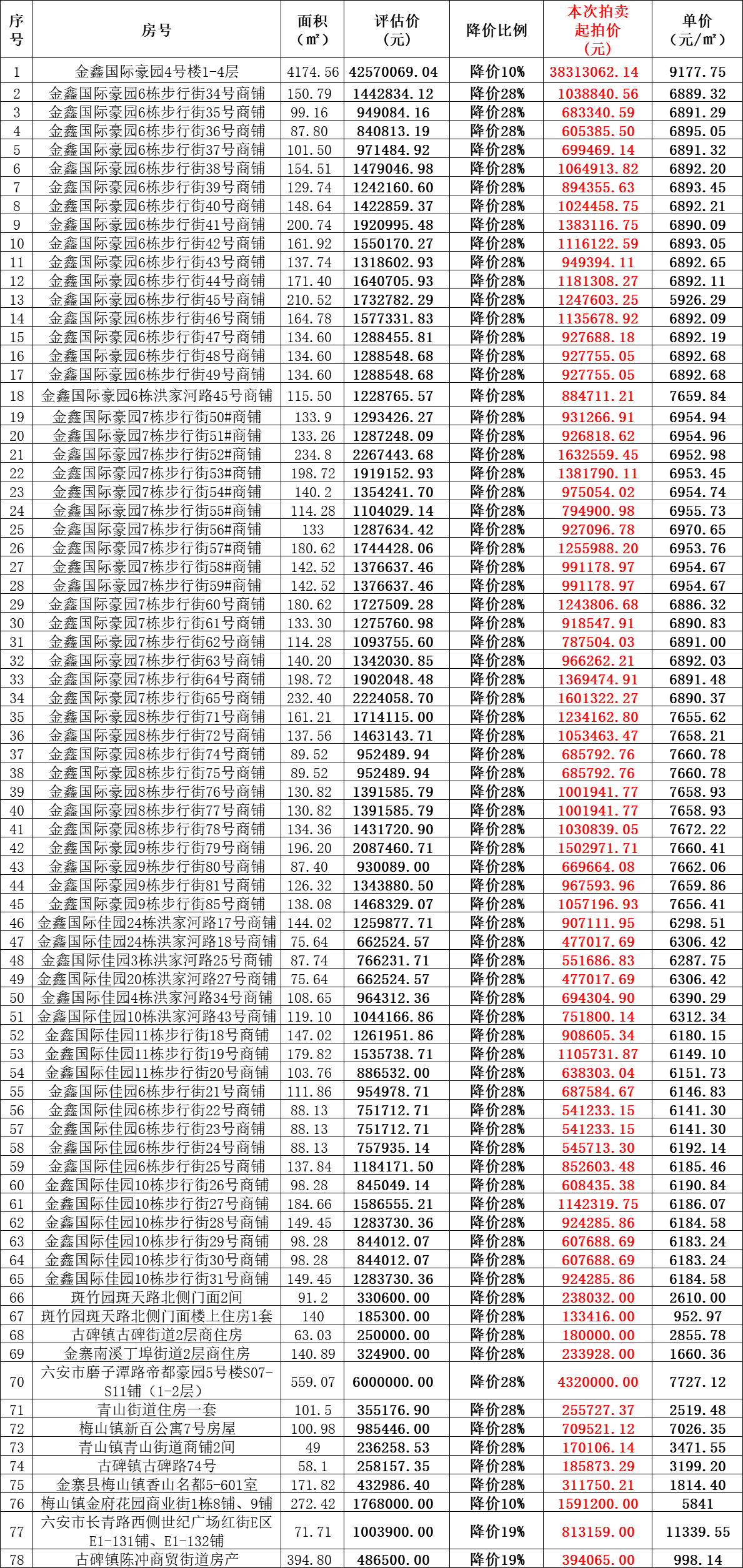 2、金寨金鑫國際豪園、國際佳園小區(qū)商鋪,64間,按間拍賣,建筑面積75㎡-230㎡/間,47-163萬元/間。具體每間面積、價格詳見所附清單。