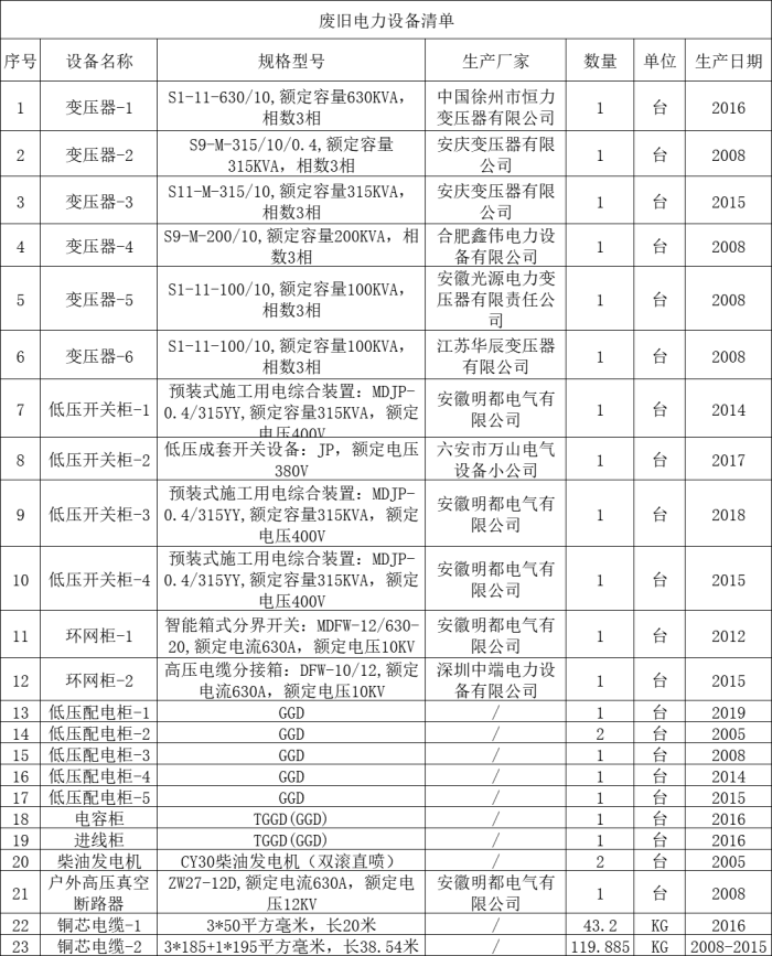 一、拍賣標(biāo)的:廢舊電力設(shè)備一批,包括:變壓器、電纜、低壓配電柜等,參考價(jià)13.96萬元。保證金2萬元。