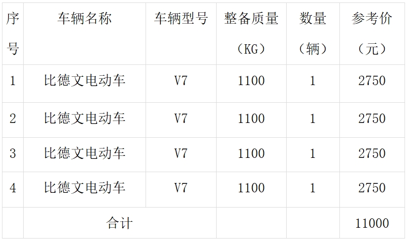 一、拍賣標的:報廢比德文V7四輪電動車4輛,打包拍賣,參考價:11000元。競拍保證金5000元。標的詳情見下方清單: