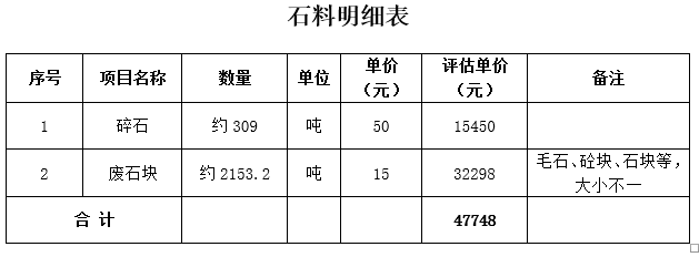 一、 拍賣標(biāo)的:罰沒砂石料一批,包括碎石、廢石塊等,參考價(jià):47748元。保證金:1萬元。以上標(biāo)的,以現(xiàn)狀整體打包拍賣,不過磅。