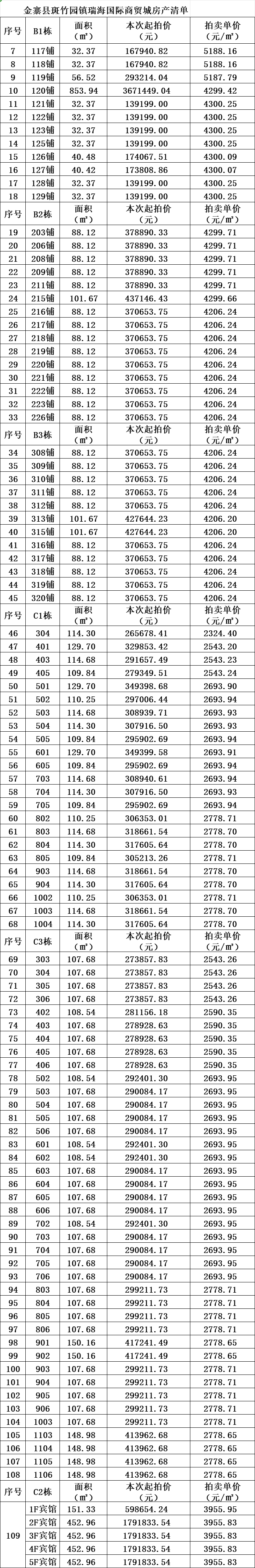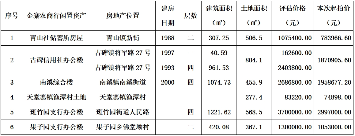 金寨農(nóng)商行房地產(chǎn):天堂寨鎮(zhèn)漁潭村土地、青山社儲蓄所房屋、古碑信用社(原古碑支行)辦公樓、斑竹園鎮(zhèn)瑞海國際商貿(mào)城商鋪及住宅房,房產(chǎn)面積約32㎡-1963㎡大小不等,標的起拍價最低7.49萬元起。具體每間面積、價格詳見下方所附拍賣清單。