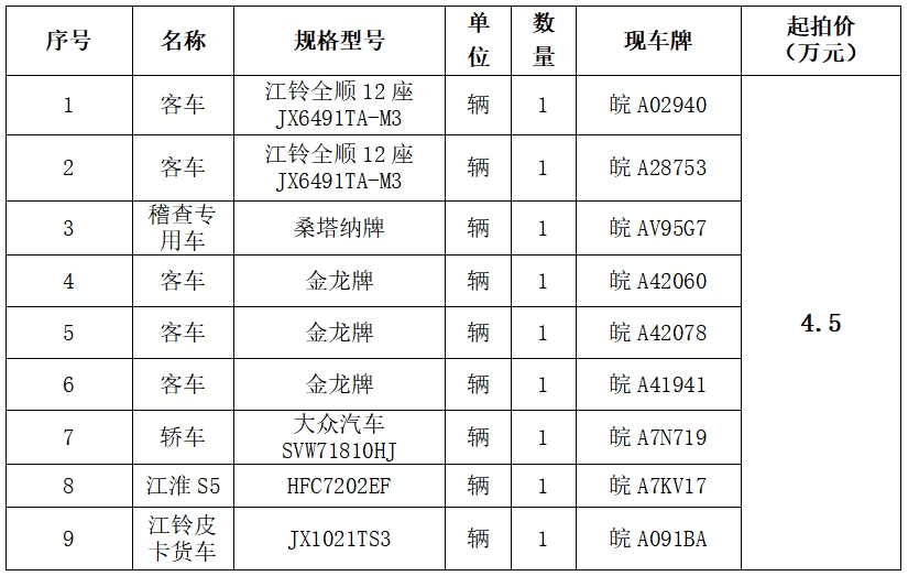 一、拍賣標(biāo)的:皖A42060金龍牌客車等9輛二手車,整體打包拍賣,參考價:4.5萬元。詳情見下表:
