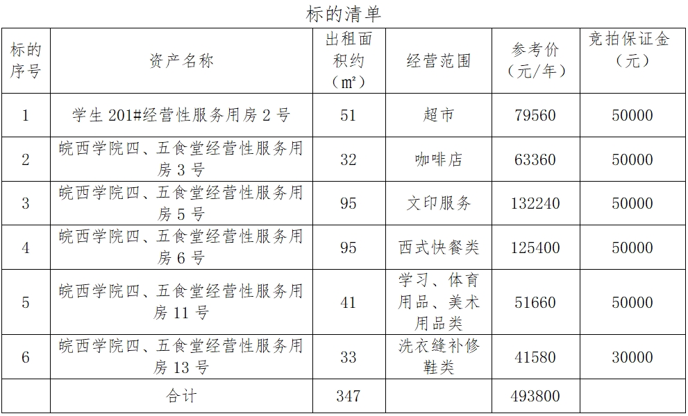 皖西學(xué)院超市、文印、洗衣、咖啡店、體育用品店等經(jīng)營(yíng)性服務(wù)用房6處三年期租賃權(quán)。詳見下表: