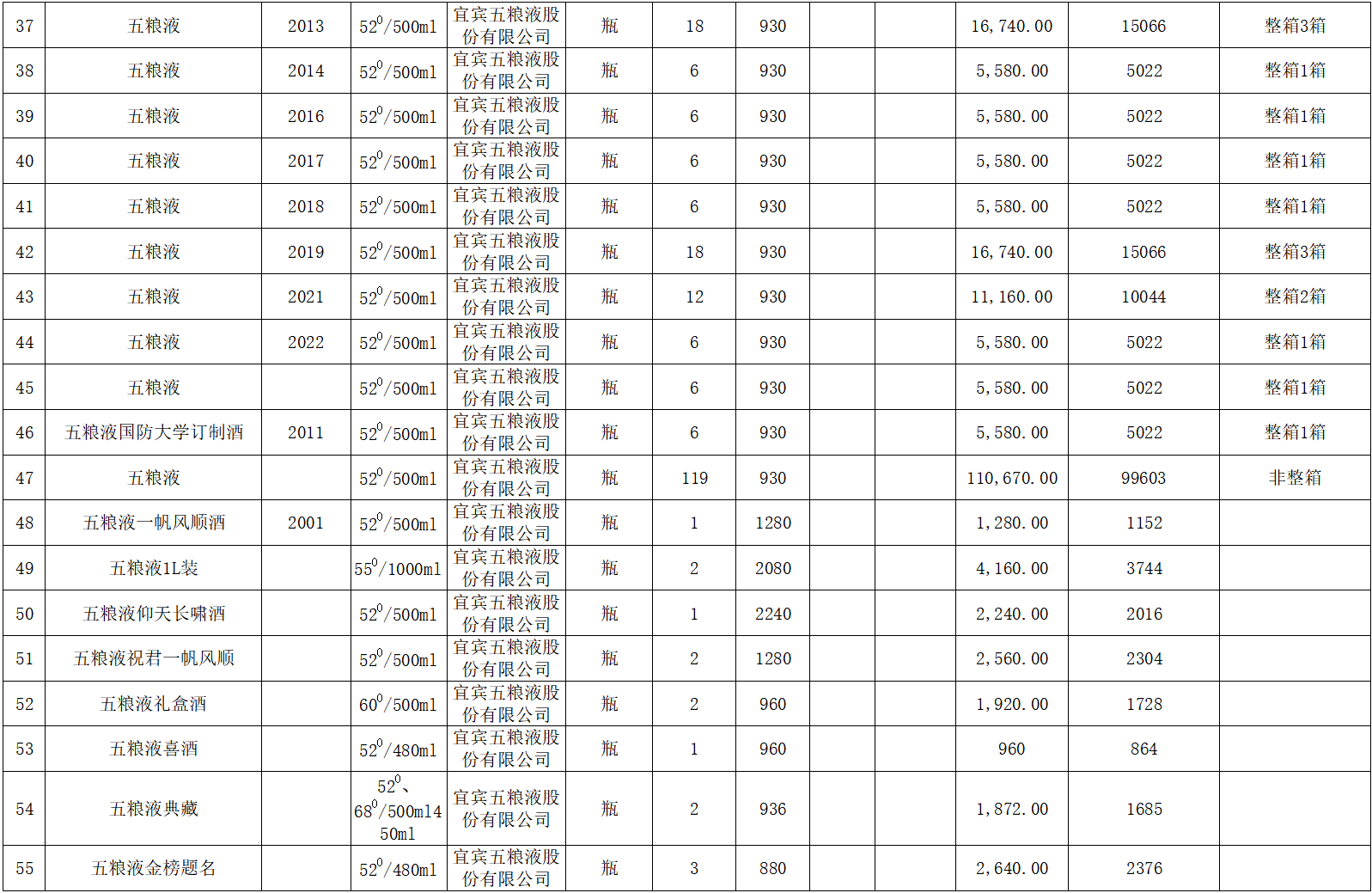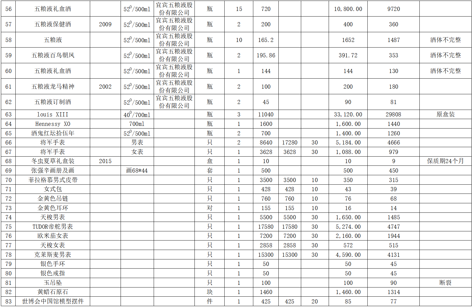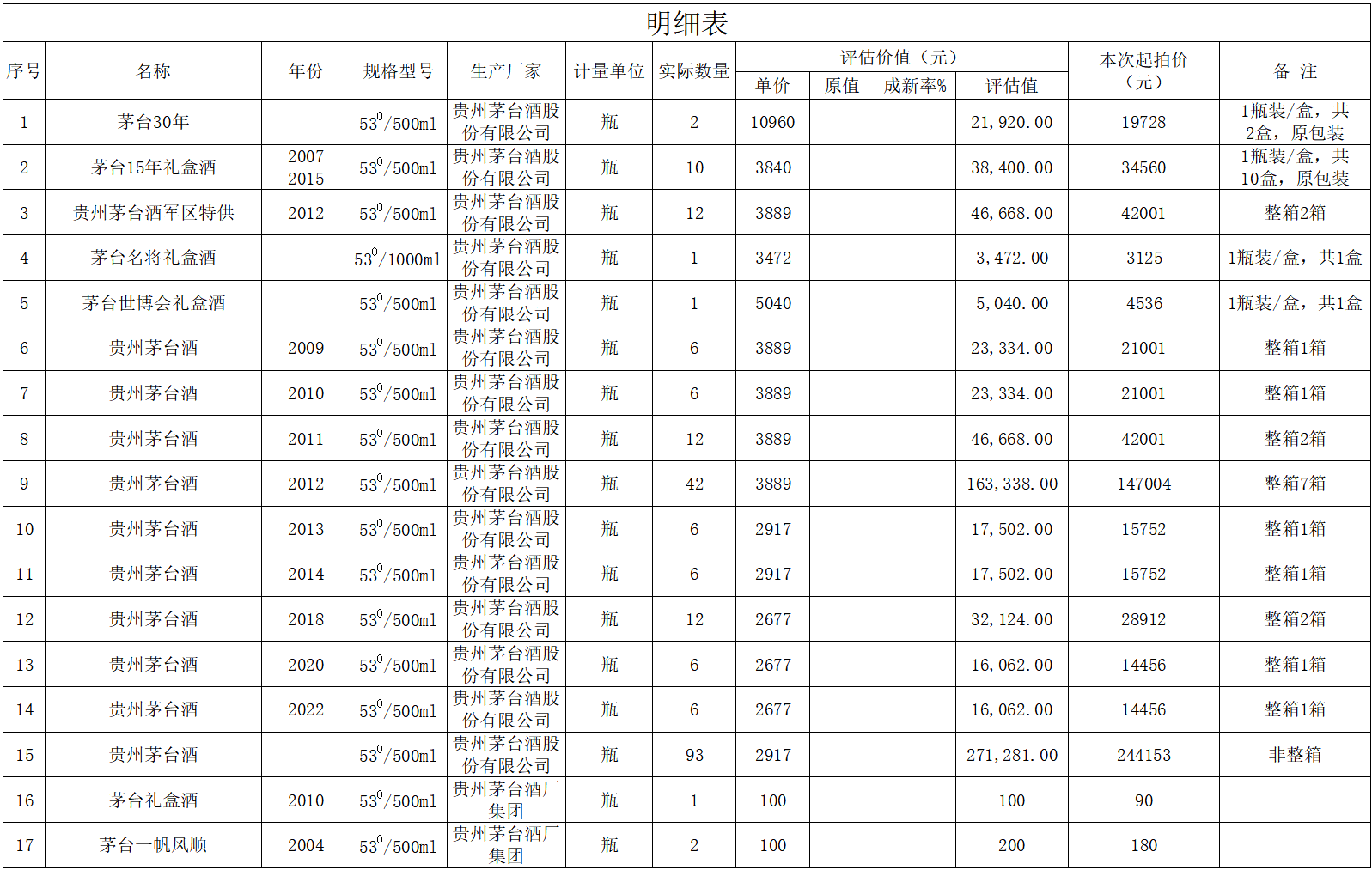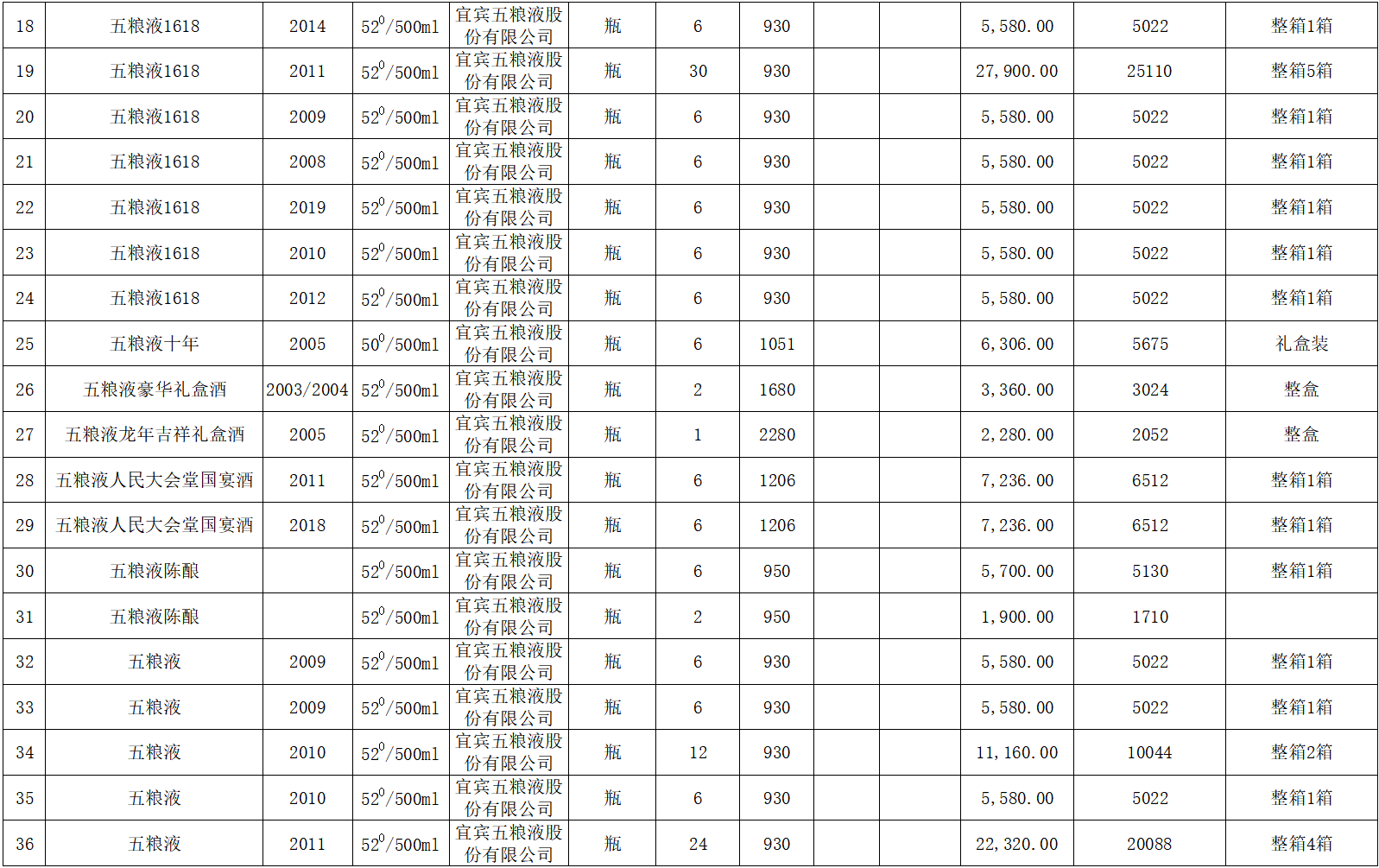 一、拍賣標(biāo)的:貴州茅臺酒計224瓶、五糧液酒計406瓶及其他酒水、物品一批,整體打包拍賣,參考價:106.047萬元。競買保證金:10萬元。詳見下方明細表: