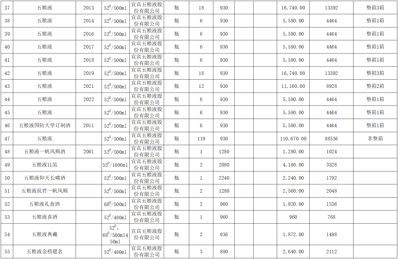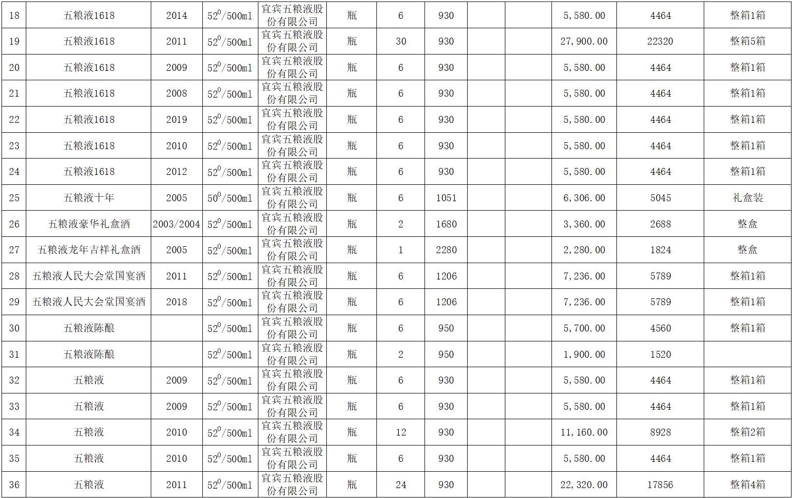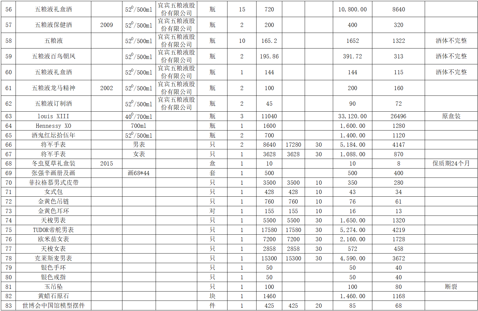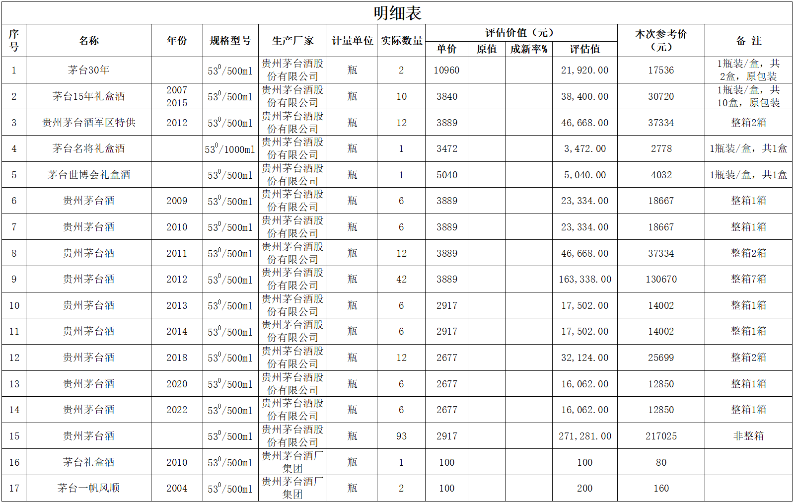 一、拍賣標(biāo)的:貴州茅臺(tái)酒計(jì)224瓶、五糧液酒計(jì)406瓶及其他酒水、物品一批,整體打包拍賣,參考價(jià):94.264萬(wàn)元。競(jìng)買保證金:10萬(wàn)元。詳見下方明細(xì)表: