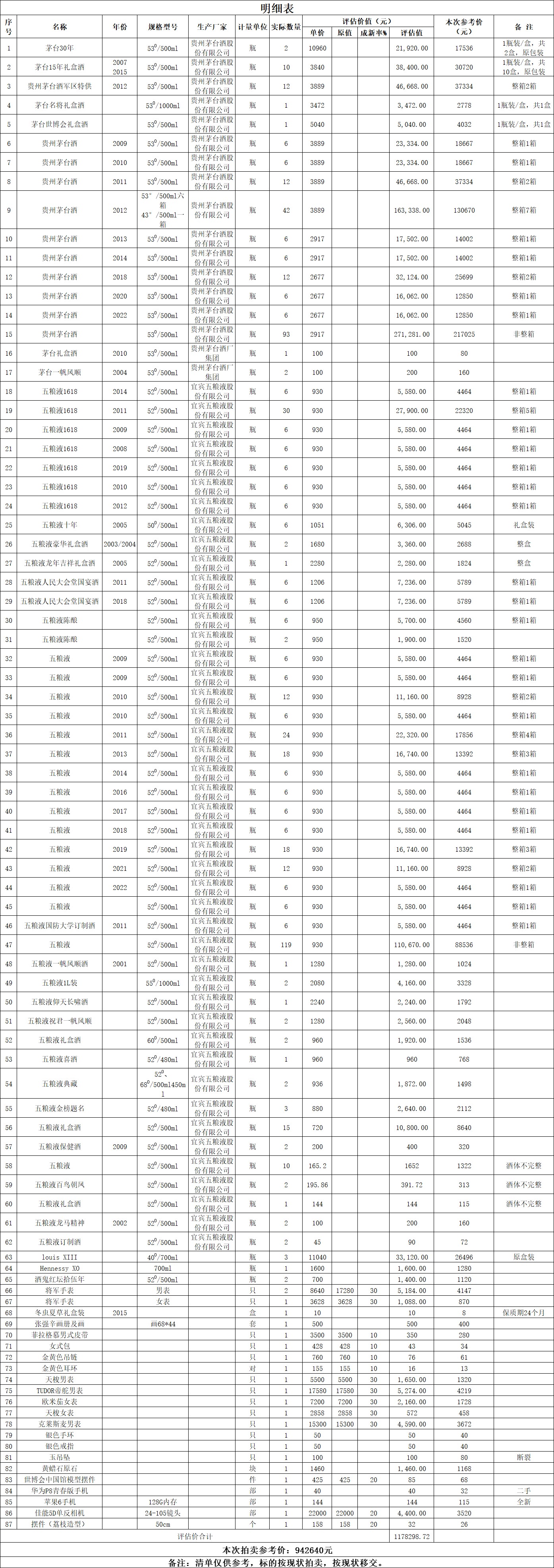 一、拍賣標(biāo)的:貴州茅臺酒計224瓶、五糧液酒計406瓶及其他酒水、物品一批,整體打包拍賣,參考價:94.264萬元。競買保證金:10萬元。詳見下方明細表: