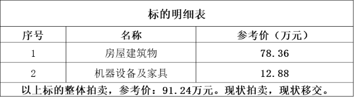 以上標的整體拍賣,參考價:91.24萬元。現(xiàn)狀拍賣,現(xiàn)狀移交。保證金:10萬元。標的詳情見中拍平臺附件《標的明細表》。