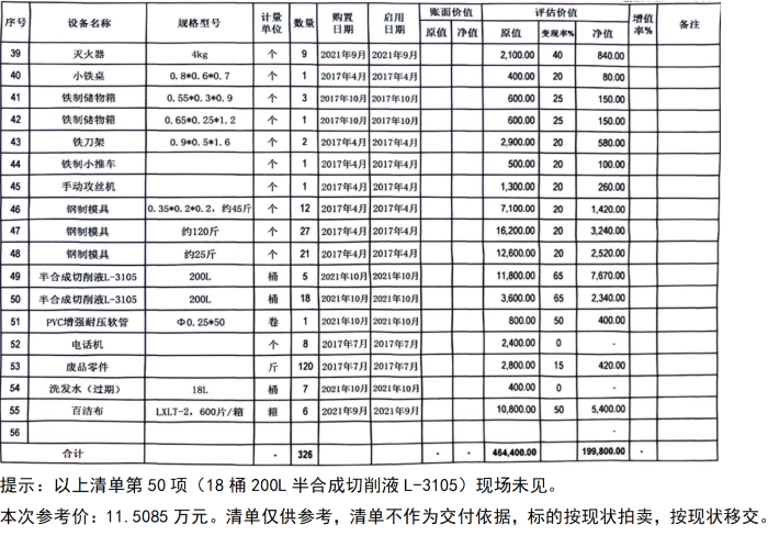 特別提示:由于標(biāo)的是廢舊物品,可能存在部件損失、不全以及規(guī)格型號不匹配等情況,現(xiàn)場數(shù)量與清單可能有差異,清單不作為交付依據(jù),以實(shí)物看樣為準(zhǔn),以現(xiàn)場實(shí)物移交。