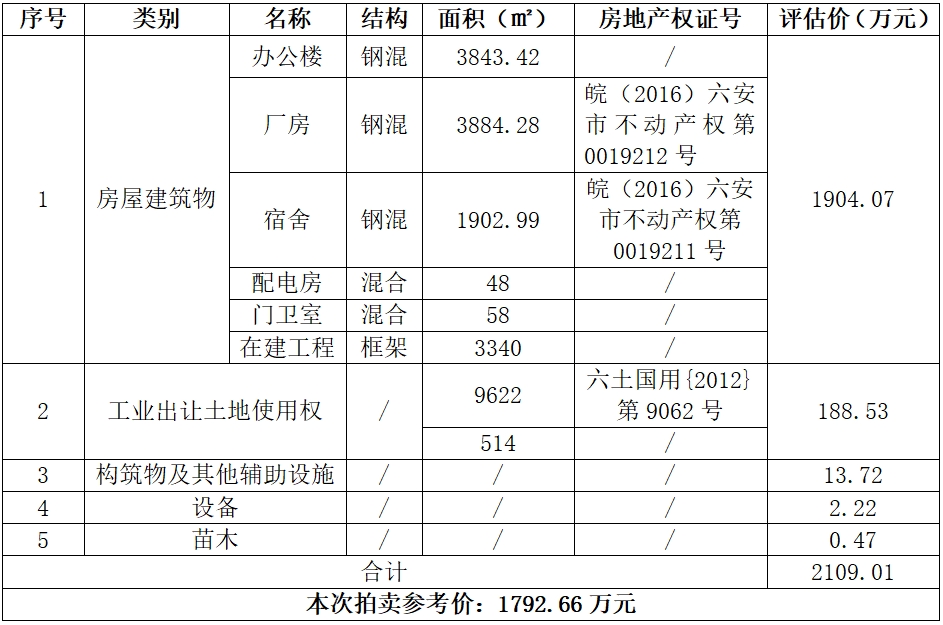1.原六安市華宏印花有限公司所有的辦公樓、廠房、宿舍等房產(chǎn),總面積約13076.69㎡。其中宿舍樓和廠房有產(chǎn)權證;