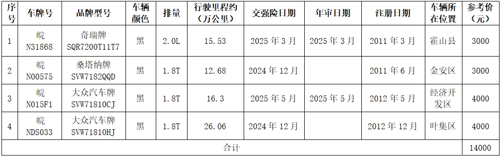 一、拍賣標(biāo)的:二手車4輛打包拍賣,詳情見下方清單,參考價:1.4萬元。保證金:1萬元。