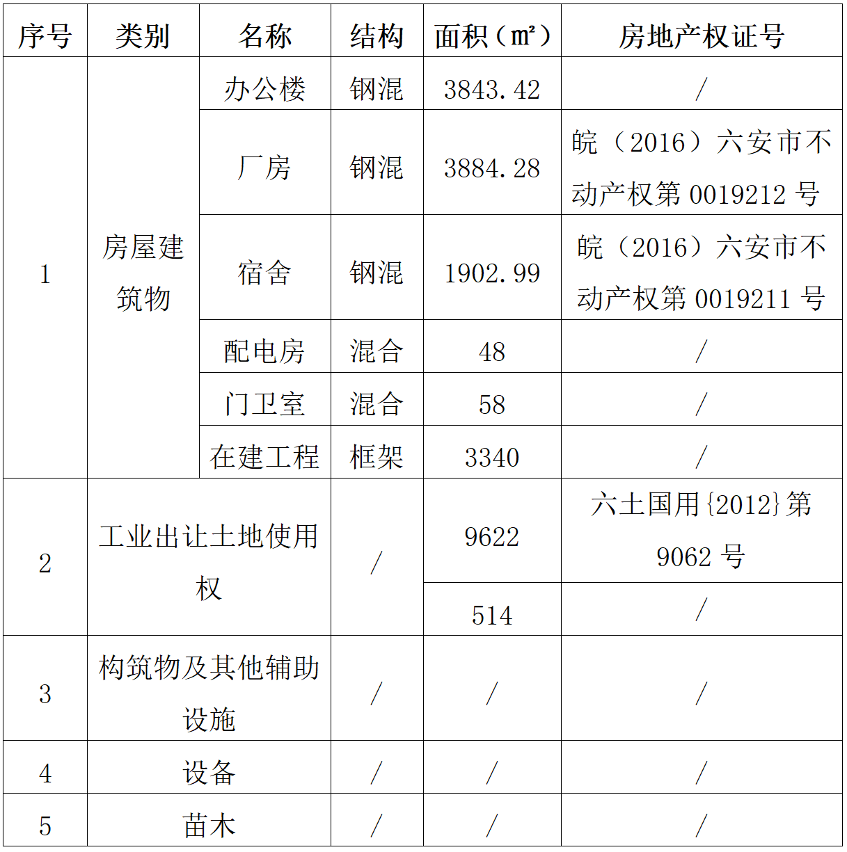 1.原六安市華宏印花有限公司所有的辦公樓、廠房、宿舍等房產(chǎn),總面積約13076.69㎡。其中宿舍樓和廠房有產(chǎn)權(quán)證。