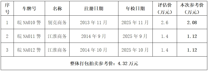 一、拍賣標(biāo)的:皖NA010警別克商務(wù)車、皖NA011警江淮商務(wù)車、皖NA012警江淮商務(wù)車等3輛二手車整體打包拍賣,參考價(jià):4.32萬元,保證金:1萬元。標(biāo)的詳情見下表: