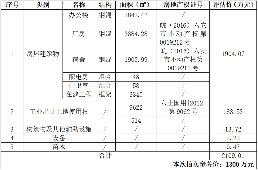 1.原六安市華宏印花有限公司所有的辦公樓、廠房、宿舍等房產,總面積約13076.69㎡。其中宿舍樓和廠房有產權證。