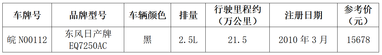 一、拍賣標(biāo)的:皖N00112尼桑天籟二手車一輛。參考價(jià):15678元,保證金:1萬元。詳見下方清單: