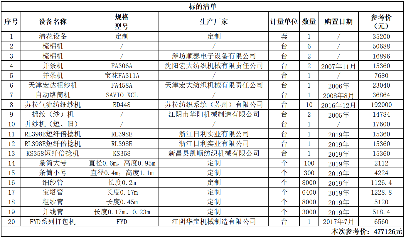 一、拍賣標(biāo)的:二手紡織設(shè)備一批,包括清花設(shè)備、自動絡(luò)筒機、梳棉機、并條機、粗紗機、細紗機等。以上標(biāo)的整體拍賣,參考價:47.7126萬元,F(xiàn)狀拍賣,現(xiàn)狀移交。競買保證金:10萬元。