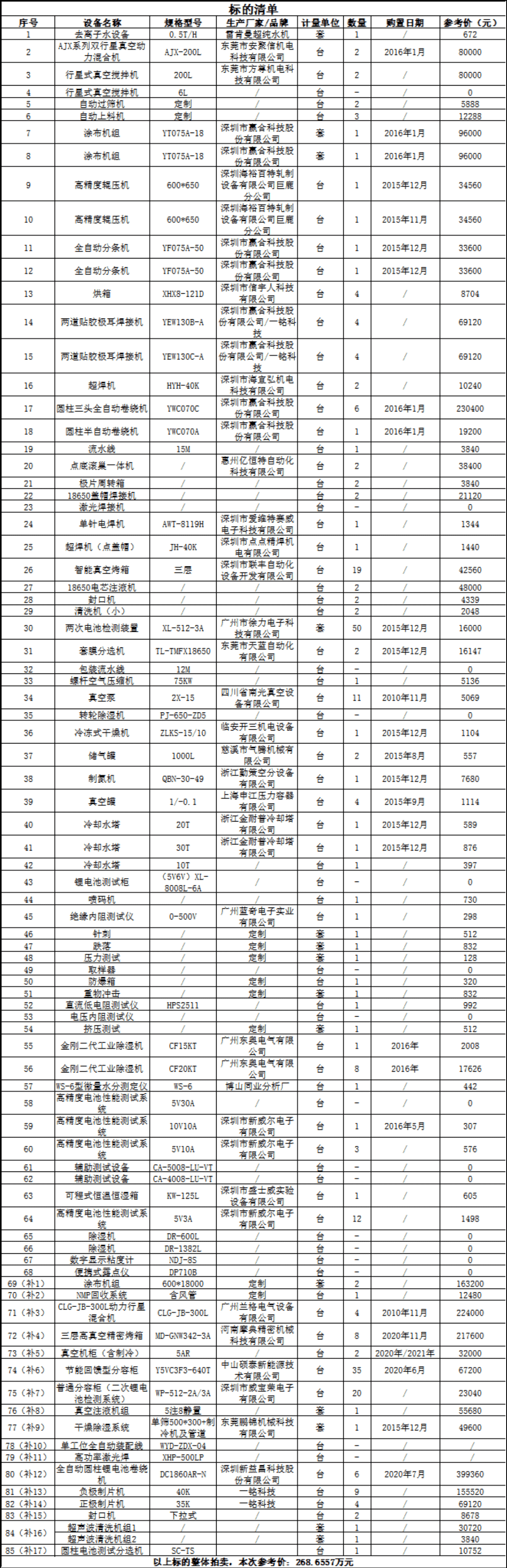 一、拍賣標(biāo)的:全自動圓柱鋰電池卷繞機(jī)、正負(fù)制片機(jī)、AJX系列雙行星真空動力混合機(jī)、圓柱三頭全自動卷繞機(jī)、行星式真空攪拌機(jī)、涂布機(jī)組等二手設(shè)備一批,整體拍賣,參考價:268.6557萬元。競買保證金:50萬元。