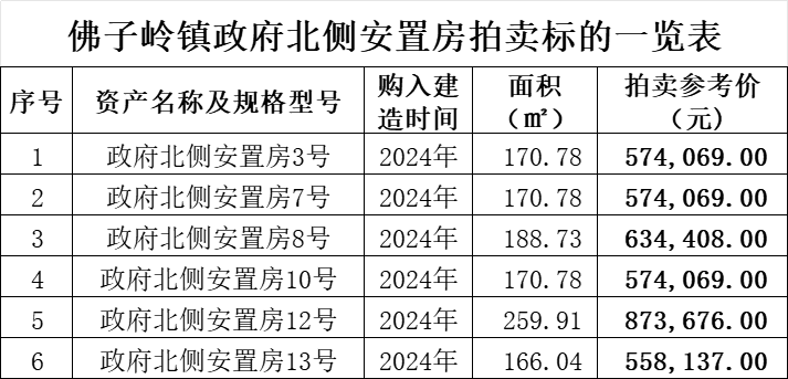 3、2025年1月24日16時拍賣:佛子嶺鎮(zhèn)政府北側安置房6套,總建筑面積約1127平方米,土地性質為國有劃撥土地,本次拍賣不含土地。(詳情及拍賣參考價等見下方附表↓)