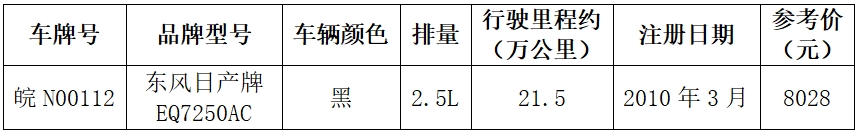 一、拍賣標(biāo)的:皖N00112尼桑天籟二手車一輛。參考價(jià):8028元,競(jìng)買保證金:5000元。詳見下方清單: