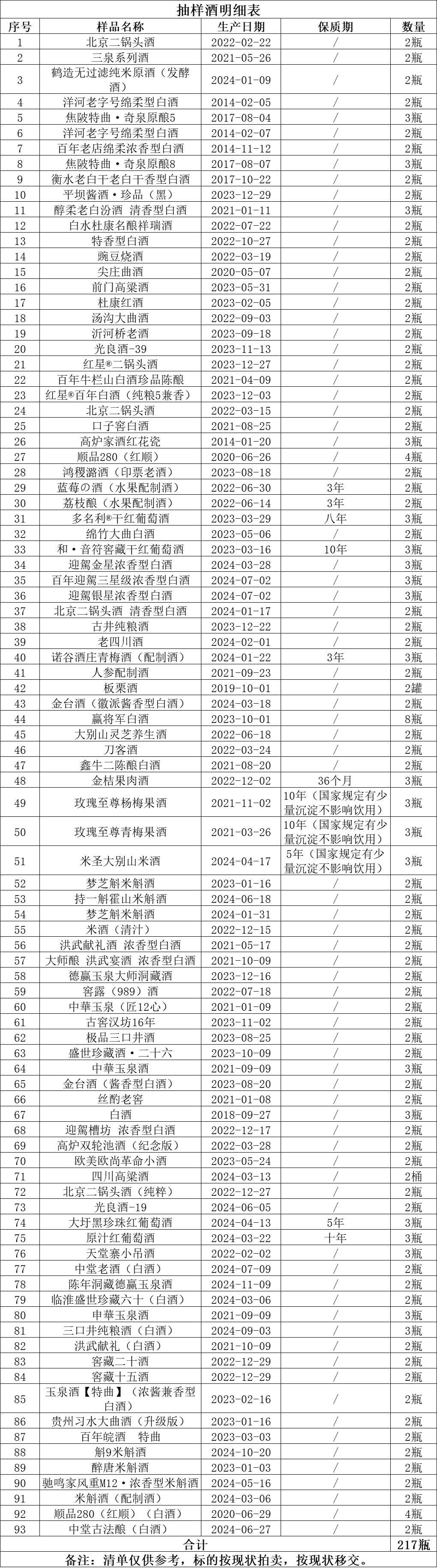 一、拍賣標的:洋河老字號綿柔型白酒、金臺酒、高爐家酒、迎駕金星、米斛酒等抽樣酒共計217瓶。整體打包拍賣,參考價:1958元。競買保證金:2000元。